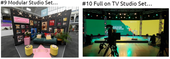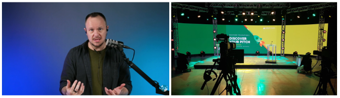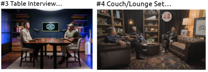 There are different levels of set design. This can be as simple as sitting in front of a plain wall with basic lighting, a microphone, and a camera, or as advanced as a full professional TV, live stream, or podcast set built on a sound stage.